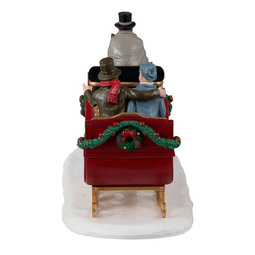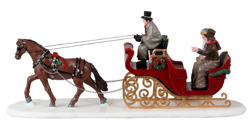 Von einem majestätischen Braunen gezogen, gleitet der rote Schlitten mit den goldenen Kufen durch die tief verschneite Landschaft. In warme Decken gehüllt genießen die zwei Passagiere das Winter-Wunderland während der Kutscher konzentriert auf die Fahrstrecke schaut.